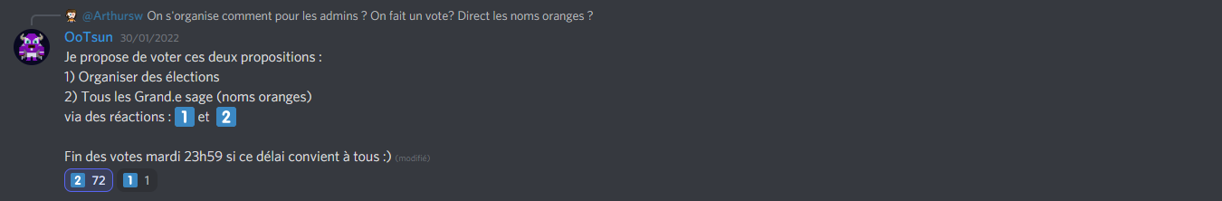 Après une importante discussion, les droits administrateurs ont été accordés aux « grands sages », c'est-à-dire aux membres qui avaient atteint un certain niveau de réputation sur le serveur. Le vote à l'origine de cette décision a été fait manuellement par emoji-réaction et est disponible ci-dessous :
